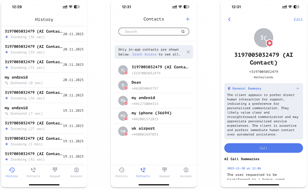 - Ongoing contact insights: As more calls come in from the same number, the app builds a running summary on the contact card. You’ll see a snapshot of previous topics, questions, or requests — useful for future follow-ups.