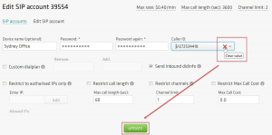 Log in to the DIDlogic Portal, go to the SIP section, and click Edit on the SIP Account. Remove the Caller ID and click Update:
