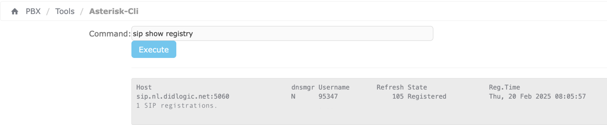 Once Elastix PBX successfully registers the trunk with the DIDLogic platform, to check the status of the registration please follow PBX > Tools > Asterisk-Cli, and in the command field enter: sip show registry and click Execute.