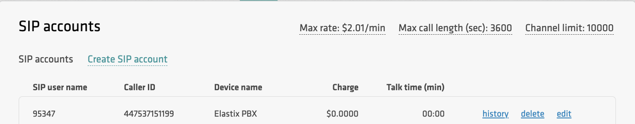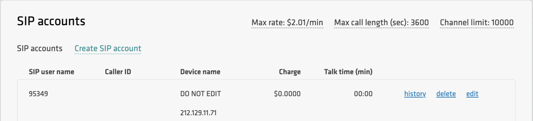 Once the Support Team has created the SIP account, it will appear in your account’s list of SIP accounts.