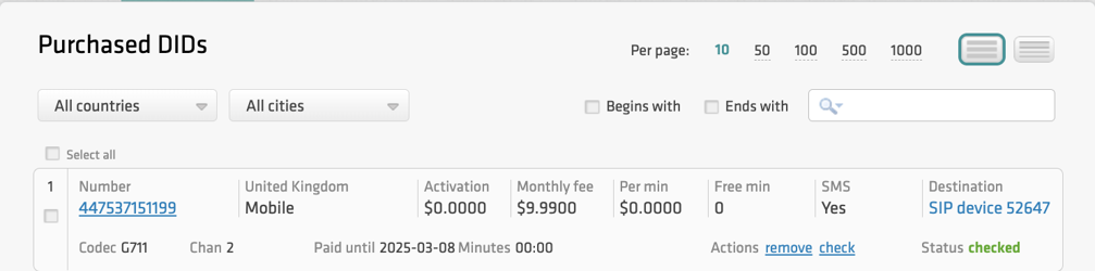 Once you have purchased the DID, it will be reflected in the PURCHASED tab.