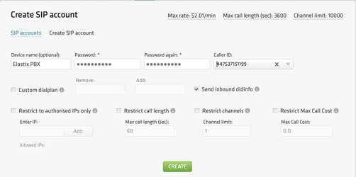 - You can optionally restrict access by specifying authorized IPs, maximum call length, channels, and maximum call cost. If these parameters are not configured, the global account limits will apply