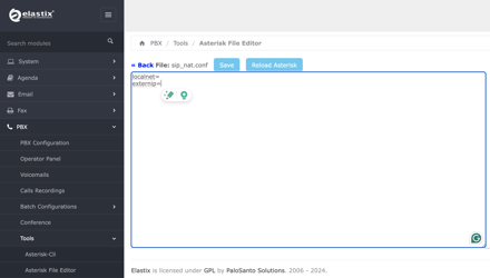 - From the left-hand navigation, go to PBX > Tools > Asterisk File Editor and filter for the sip_nat.conf file.