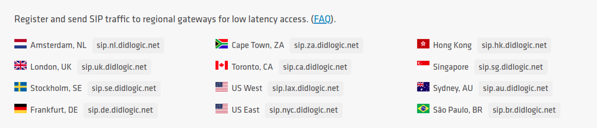 - Hostname: In the “host” field, enter one of DIDLogic’s regional SIP Gatewat addresses. For optimal connectivity, choose the gateway closest to your location. The complete list of regional SIP gateways is under the “SIP” section on the DIDLogic platform.