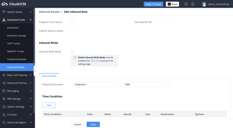 - Navigate to Extension/Trunk>> Inbound Rules in the left-hand menu and click the Add button.