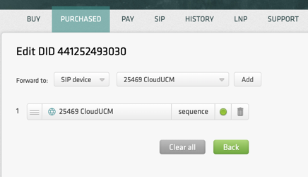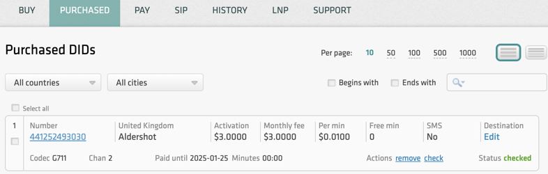 Once you have purchased the DID, it will be reflected in the PURCHASED tab.