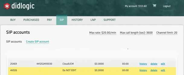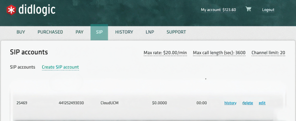 Once the Support Team has created the SIP account, it will appear in the list of SIP accounts in your account.