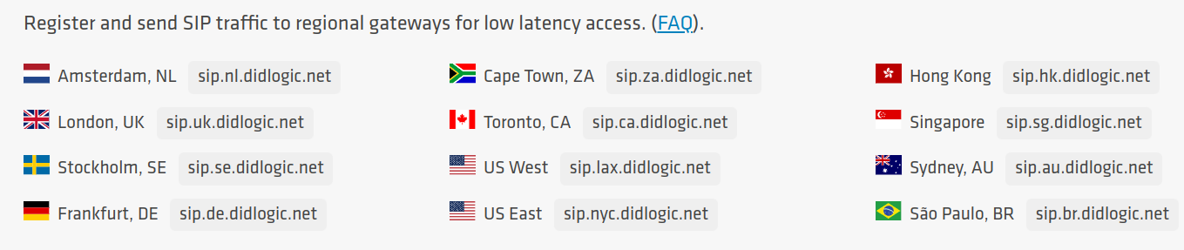 - Hostname or IP Address: Enter a DIDlogic regional SIP gateway closest to your location. The list of regional gateways can be found under SIP Accounts in the SIP tab on the user portal.