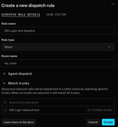 By default, the rule applies to all inbound calls within your LiveKit project. You can also associate it with specific trunks in the Match trunks section.