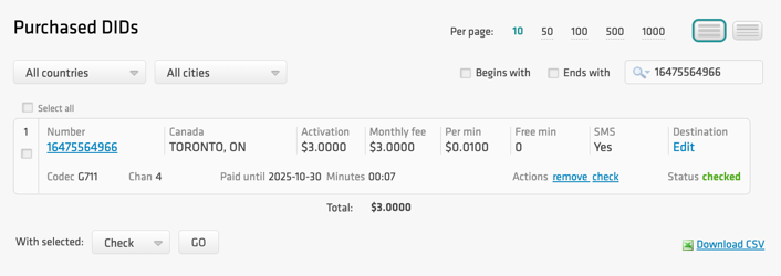 Once you have purchased the DID, it will be reflected in the PURCHASED tab.