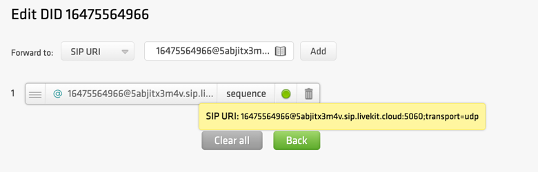 - FQDN is SIP URI of your LiveKit AI platform. You can find your SIP URI by navigating to the ‘Settings’ section and then selecting the ‘Project’ page, where it is displayed under the “SIP URI” field. We’ll use only the part after the colon to configure inbound call routing on DIDlogic.