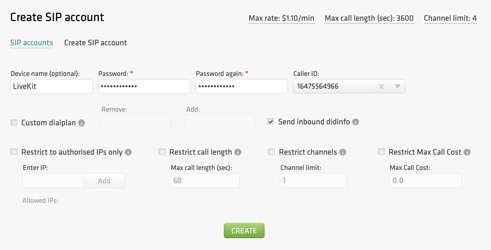 - You can optionally restrict access by specifying authorized IPs, maximum call length, channels, and maximum call cost. If these parameters are not configured, the global account limits will apply