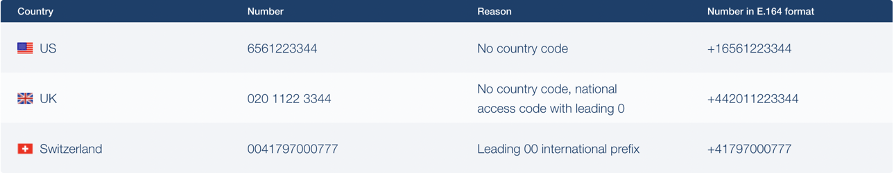 Below are typical examples of phone numbers incorrectly formatted according to the E.164 international standard: