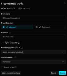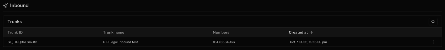 - Click Create, and your new trunk will appear in the Inbound trunks section.