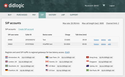 sip.***.didlogic.net – instead of *** please select one of DIDLogic’s regional SIP gateways. The full list located at the bottom of the “SIP” tab when you log in to http://didlogic.com.